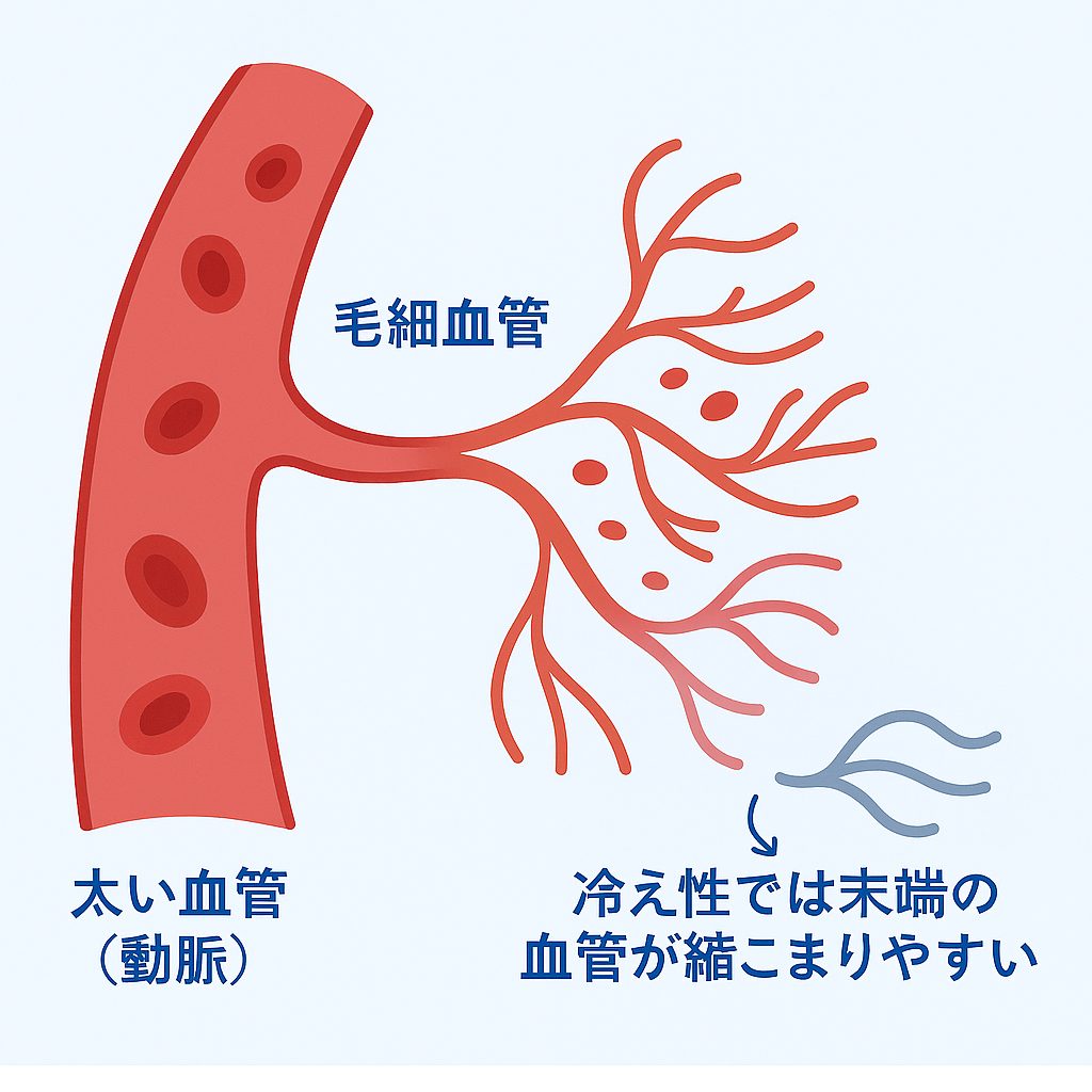 002 太い血管と毛細血管の違い、冷え性で末端の血管が縮こまりやすい仕組みの図解